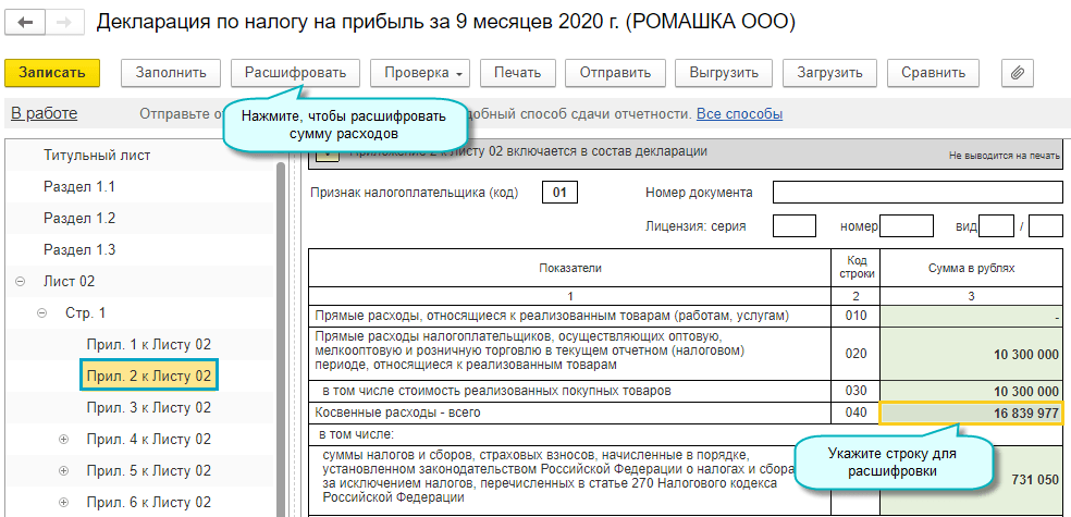 Добавлена детализация в расшифровку расходов в декларации по налогу на прибыль: