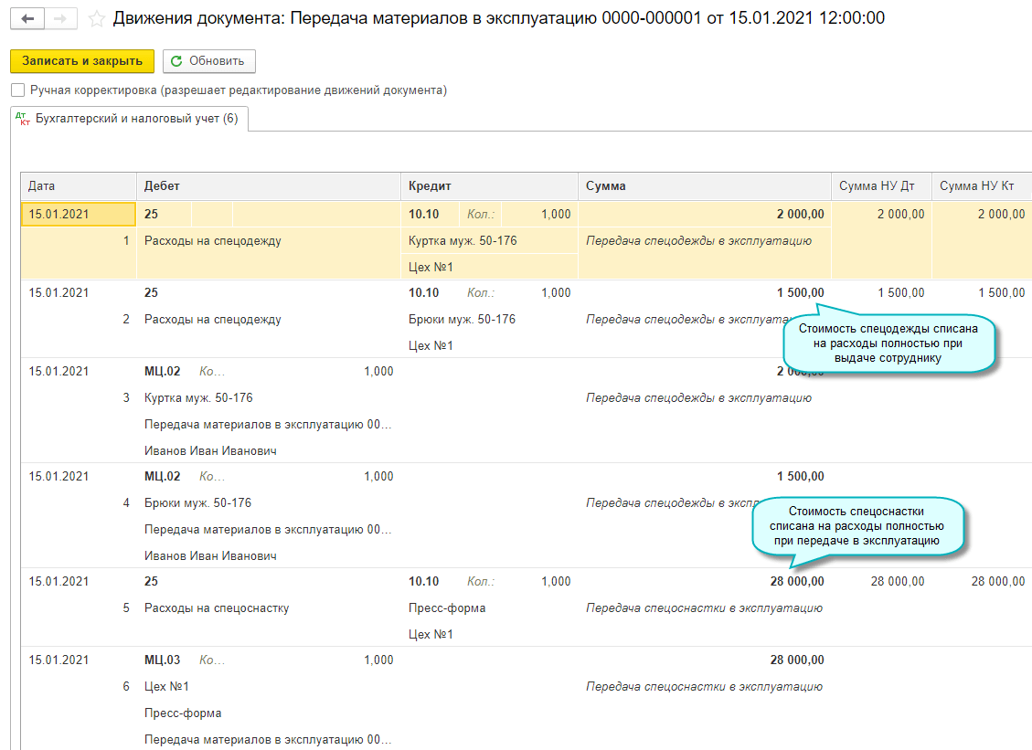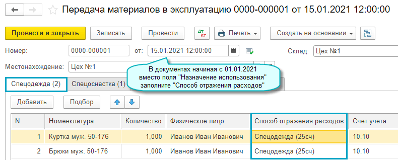 С 2021 года изменен порядок списания на расходы стоимости спецодежды и спецоснастки. Новыми правилами учета не предусмотрены способы списания стоимости в течение срока полезного использования или пропорционально объему продукции (работ, услуг). Стоимость спецодежды и спецоснастки, признанных запасами, подлежит единовременному списанию на расходы при передаче в эксплуатацию (Приказ Минфина России от 15.11.2019 № 180н).