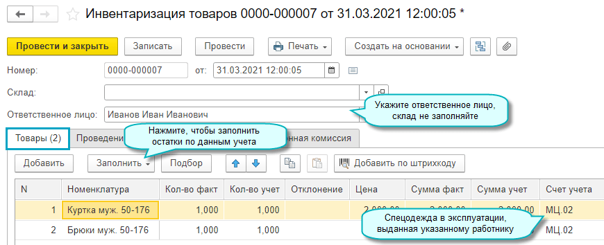 Добавлена возможность инвентаризации спецодежды и инвентаря, переданных в эксплуатацию. Инвентаризационные описи заполняются по остаткам на забалансовых счетах МЦ.02 "Спецодежда в эксплуатации" и МЦ.04 "Инвентарь и хозяйственные принадлежности в эксплуатации" для указанного работника.