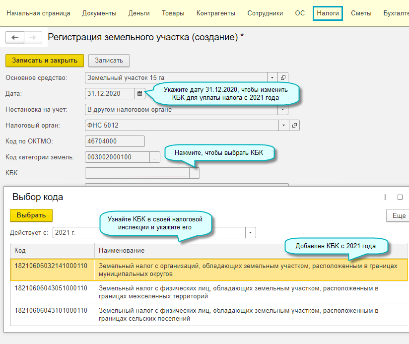 Добавлен КБК для уплаты земельного налога с 2021 года (Приказ Минфина России от 12.10.2020 № 236н).