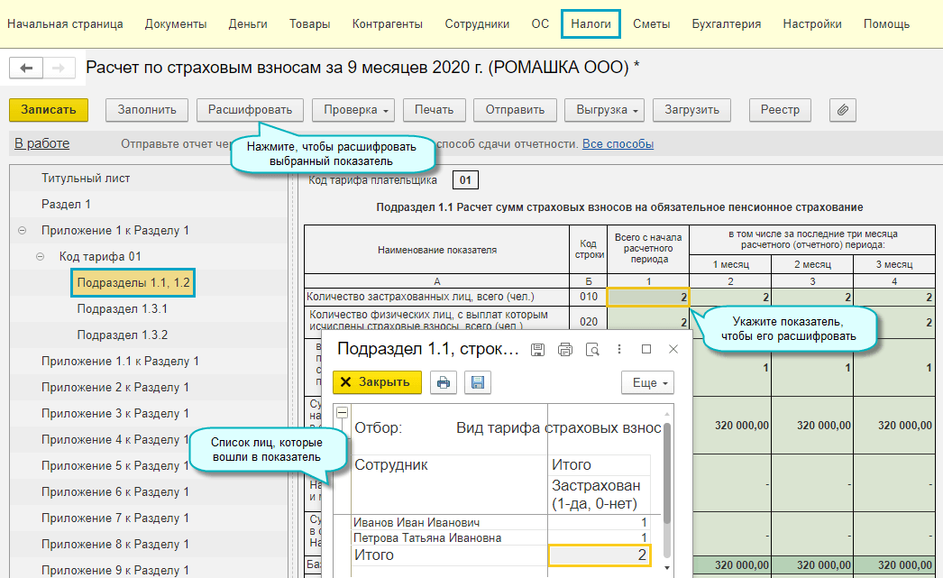 Добавлена возможность расшифровки застрахованных лиц в Расчете по страховым взносам. Расшифровать можно показатели строки 010 Подразделов 1.1 и 1.2 Приложения 1 к Разделу 1.