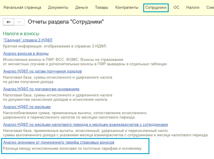 Простой интерфейс: меню "Сотрудники - Основное - Отчеты - Все отчеты... - Налоги и взносы - Анализ экономии от пониженного тарифа страховых взносов ".