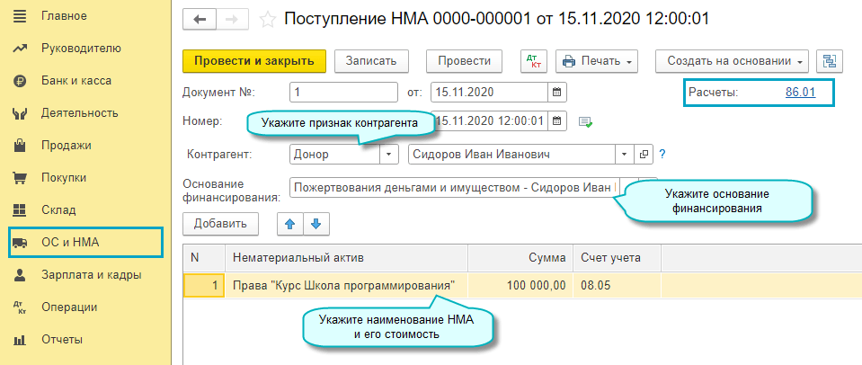 Полный интерфейс: меню "ОС и НМА - Нематериальные активы - Поступление НМА".