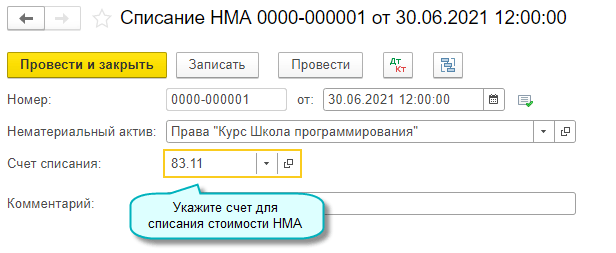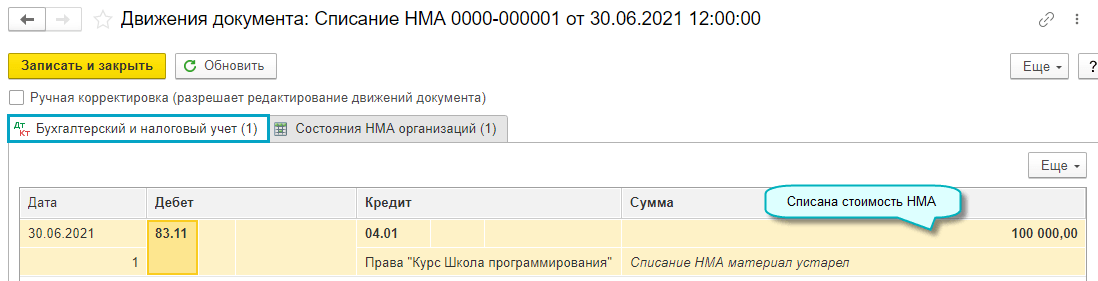 Полный интерфейс: меню "ОС и НМА - Нематериальные активы - Списание НМА".