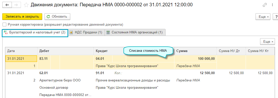Полный интерфейс: меню "ОС и НМА - Нематериальные активы - Передача НМА".