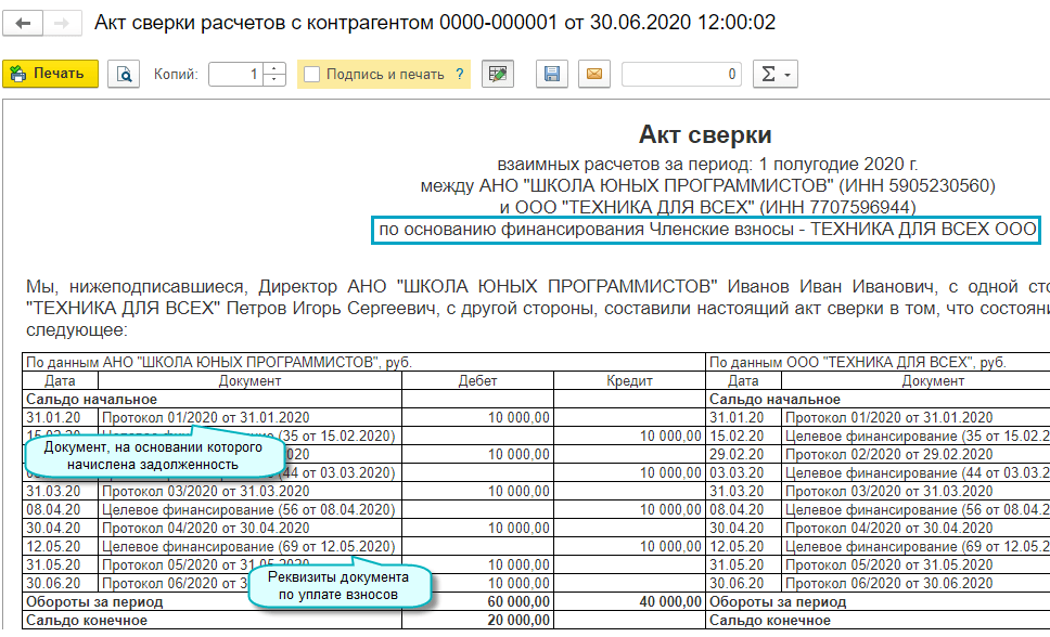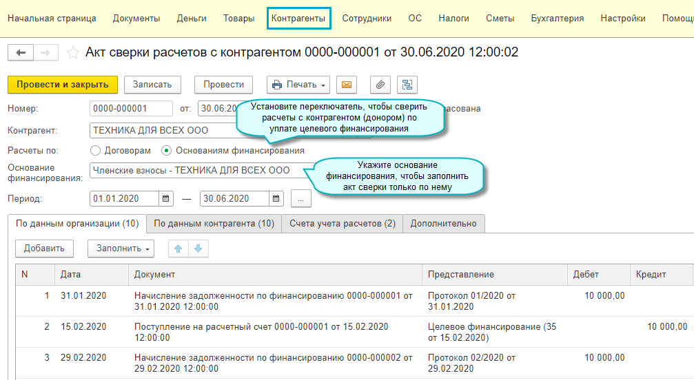 Полный интерфейс: меню "Деятельность - Целевое финансирование - Акты сверки расчетов".
