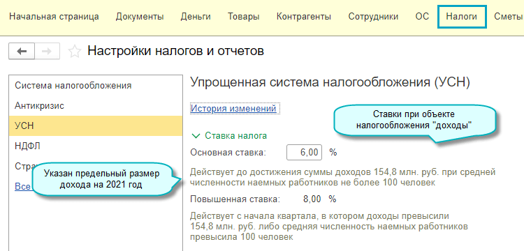 Полный интерфейс: меню "Главное - Настройки - Налоги и отчеты - Настройки налогов и отчетов - УСН".