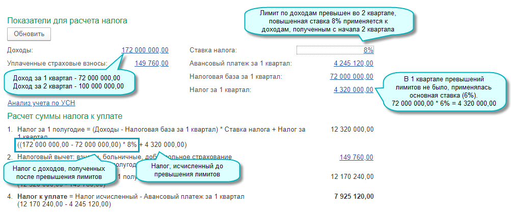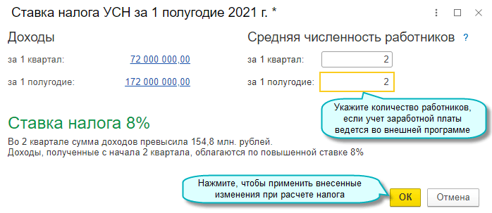 В 2021 году с квартала, в котором доходы превысили 154,8 млн. руб. (но не более 200 млн. руб.) и (или) средняя численность работников превысила 100 человек (но не более 130 человек), применяется налоговая ставка УСН: