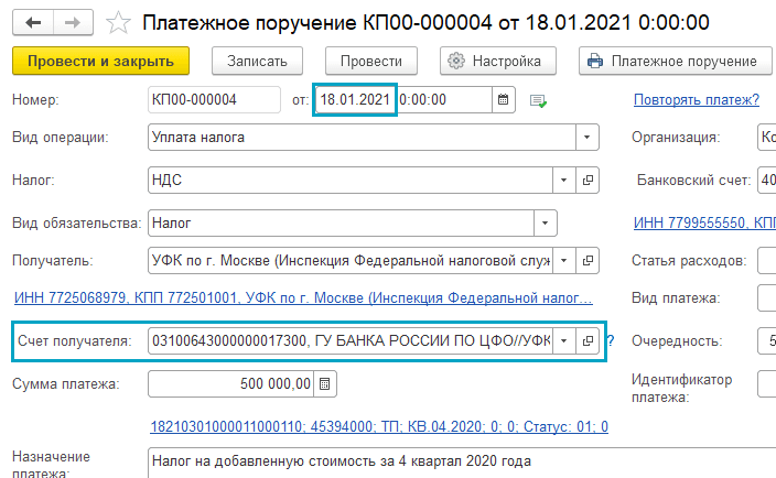 Добавлена возможность при перечислении денежных средств в бюджет указывать информацию о платеже по правилам, действующим с 01.10.2021 (Приказ Минфина России от 14.09.2020 № 199н).