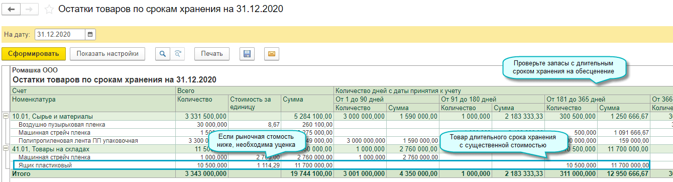 Отчет может использоваться при анализе необходимости обесценения запасов с длительными сроками хранения (п.25 ПБУ 5/01 "Учет материально-производственных запасов", п.30 ФСБУ 5/2019 "Запасы").