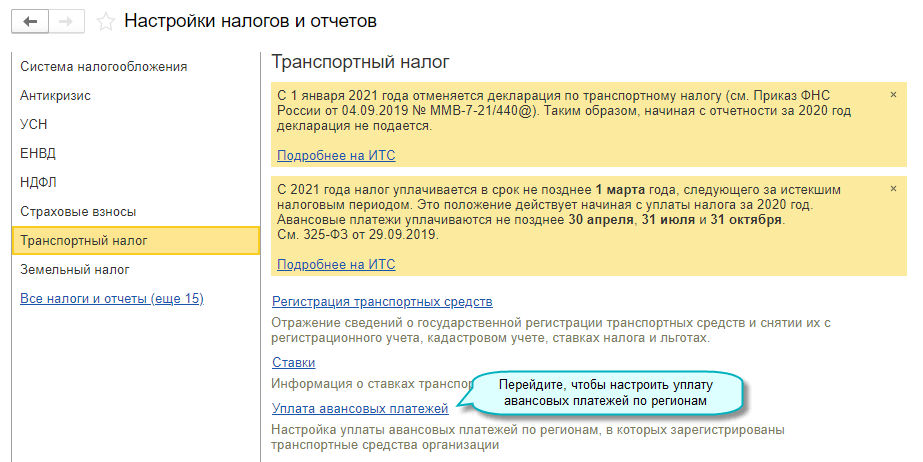 Полный интерфейс: меню "Главное - Настройки - Налоги и отчеты - Настройки налогов и отчетов - Транспортный налог".
