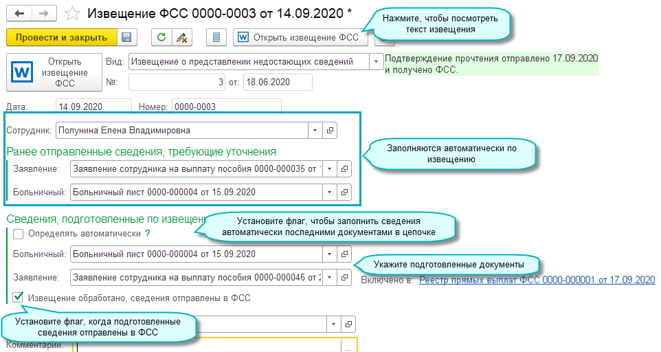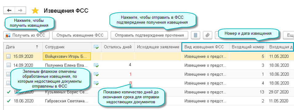 Добавлена возможность получения извещений ФСС о предоставлении недостающих документов или сведений для прямой выплаты пособий. Для получения извещений достаточно подключения к 1С-Отчетности. Подтверждение о получении извещения необходимо отправить в течение 1 рабочего дня со дня его получения. Если не отправить подтверждение в течение 3 рабочих дней после этого срока, ФСС направит такое извещение заказным письмом (Постановление Правительства РФ от 21.04.2011 № 294).