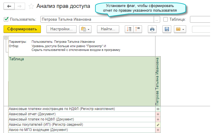 Полный интерфейс: меню "Администрирование - Настройки пользователей и прав - Пользователи - Анализ прав доступа".