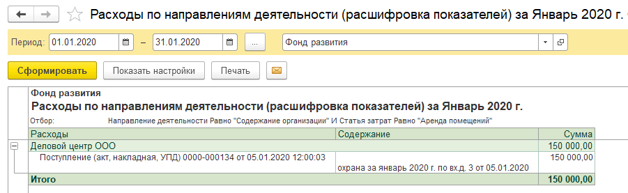 Полный интерфейс: меню "Деятельность - Отчеты - Расходы по направлениям деятельности".