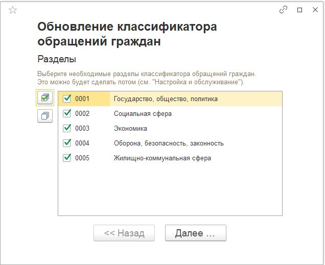 Это можно сделать сразу с помощью помощника обновления или позже в настройках программы (Настройка и обслуживание – Классификатор обращений граждан).