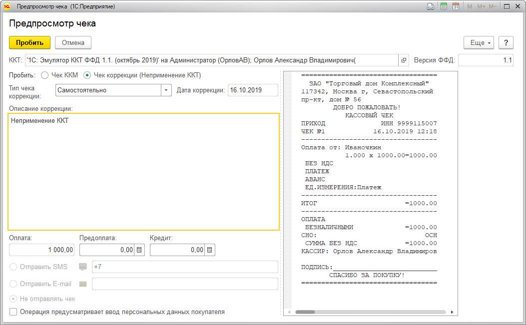 Для этого в форме Предпросмотр чека, которая открывается по ссылке Пробить чек, необходимо установить переключатель в положение Чек коррекции (Неприменение ККТ).