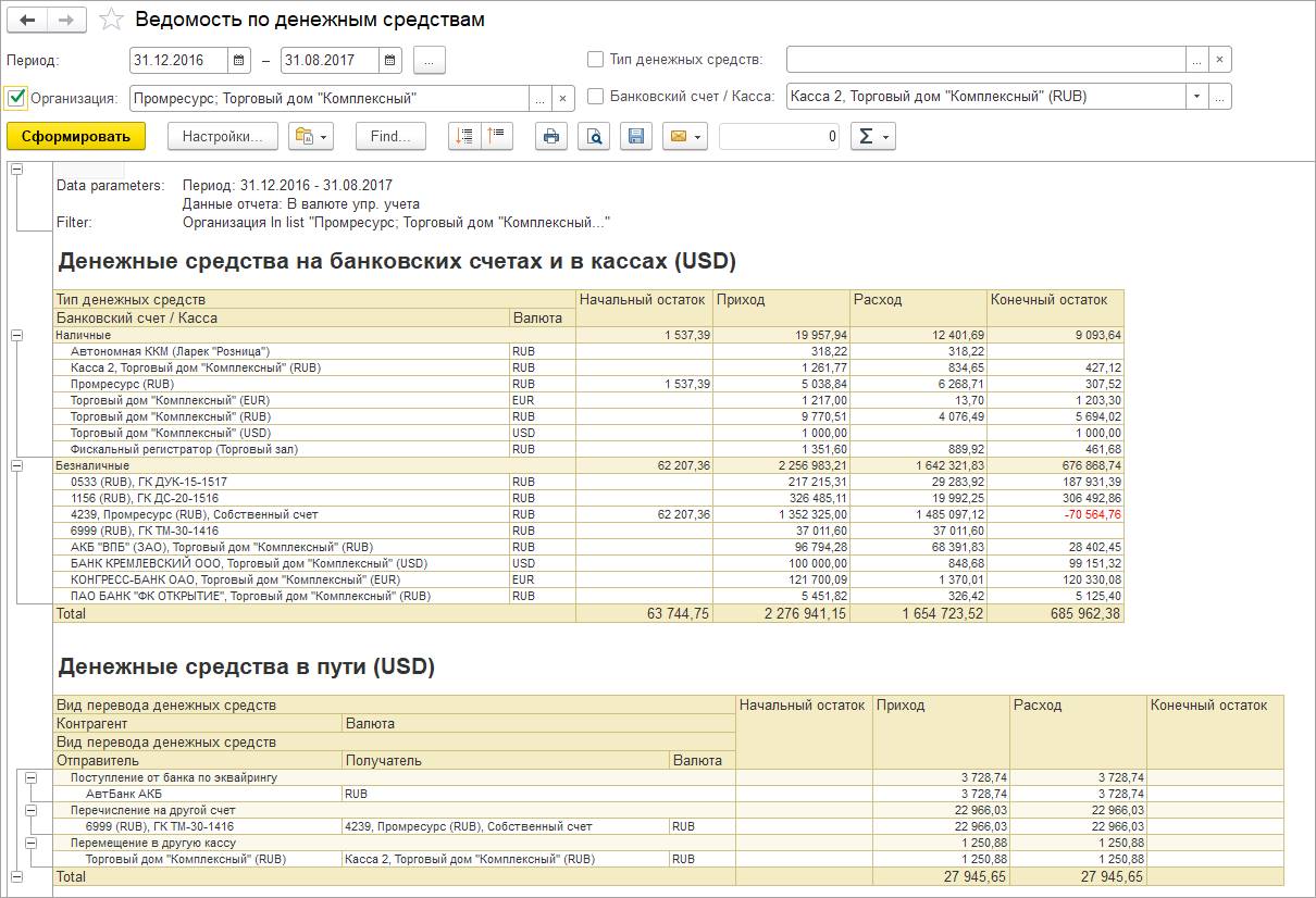 Отчет может быть выведен в валюте управленческого или регламентированного учета, а также в валюте счета или кассы (валюта мест хранения). Если в аналитике группировки содержатся разновалютные данные, то они не пересчитываются в единую валюту, а выводятся во всех имеющихся валютах. Это справедливо для вывода данных в валюте В валюте мест хранения. В остальных случаях все данные пересчитываются в валюту управленческого или регламентированного учета.