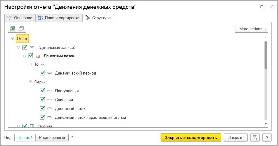 Отчет по структуре содержит информацию о сальдо денежных средств на начало и конец отчетного периода, содержит разделы по поступлению и списанию денежных средств, далее информация детализируется до аналитических разделов, например, до статей движения денежных средств.