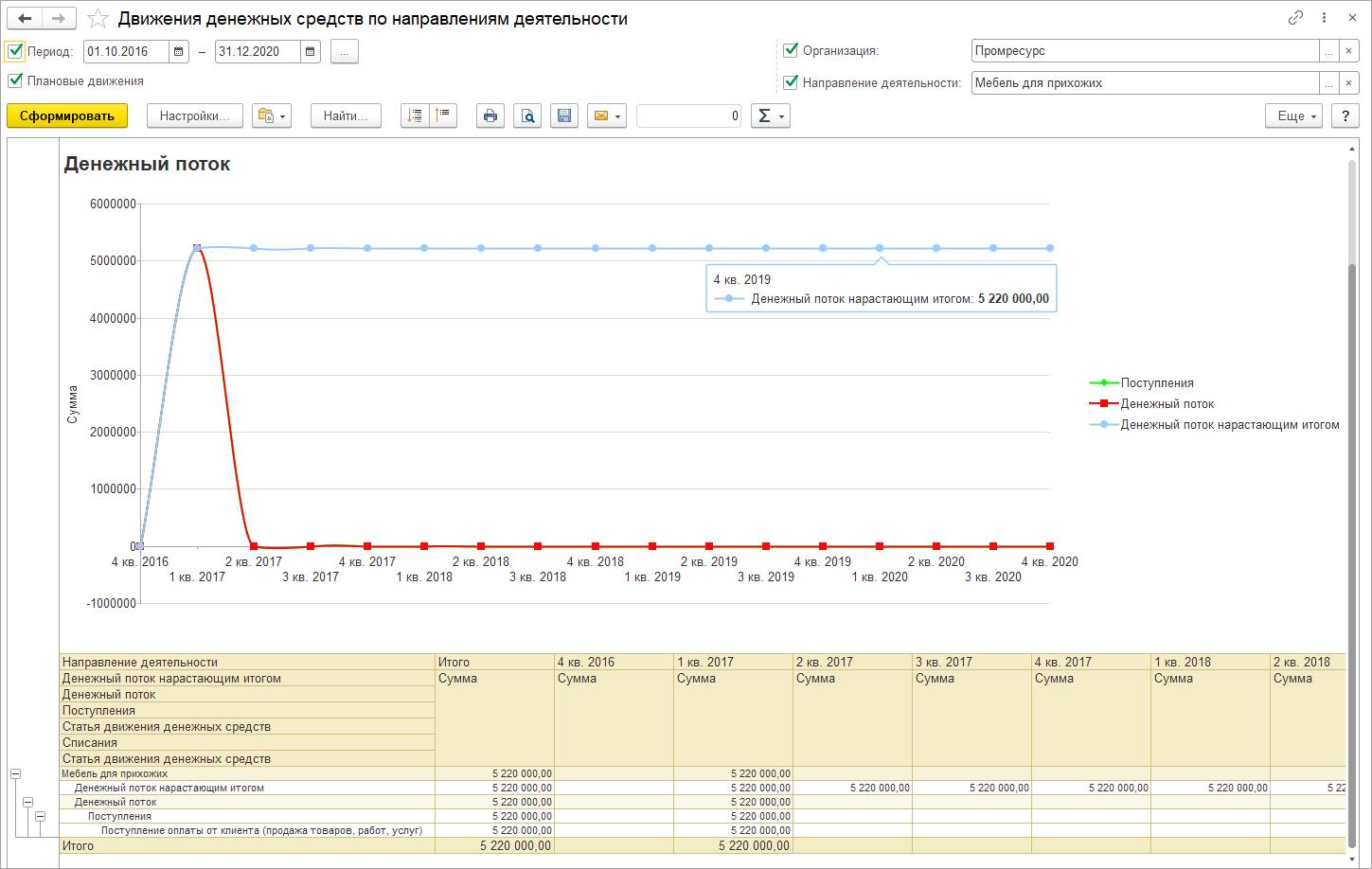 В данном варианте отчета можно наложить отбор в шапке отчета на направление деятельности, в рамках которого требуется оценить денежные потоки. В результате будет получен график и табличный отчет по движениям ДС: