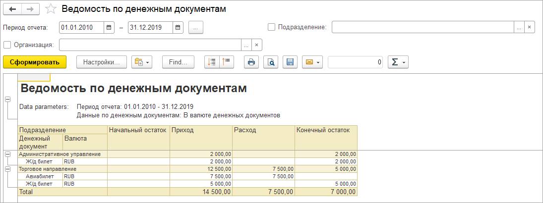 Данный отчет предназначен для анализа движений денежных документов, отчет содержит информацию о закупках денежных документов, а также о передаче их подотчетным лицам.