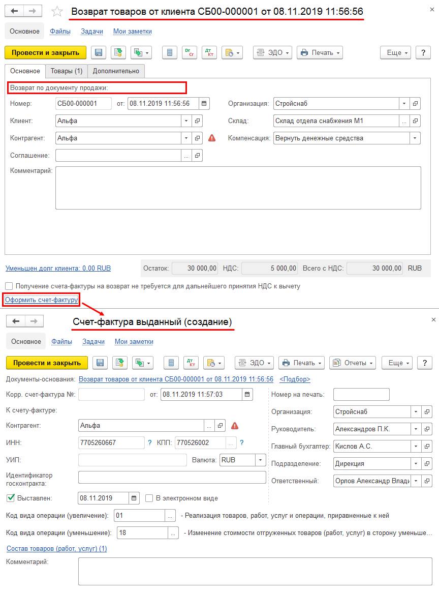 Поддержано формирование документов Счет-фактура выданный на основании документов Возврат товаров от клиента и Возврат товаров между организациями (гиперссылка Оформить счет-фактуру), если документы возврата оформлены без указания первоначального документа реализации.