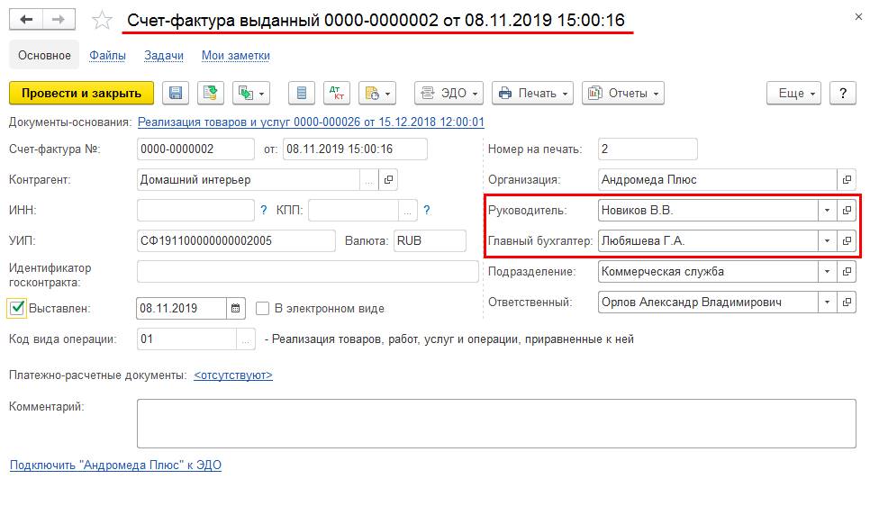 Обеспечена возможность указания подписантов счета-фактуры, отличных от основных ответственных лиц организации. Для этого в документ Счет-фактура выданный добавлены поля Руководитель и Главный бухгалтер.