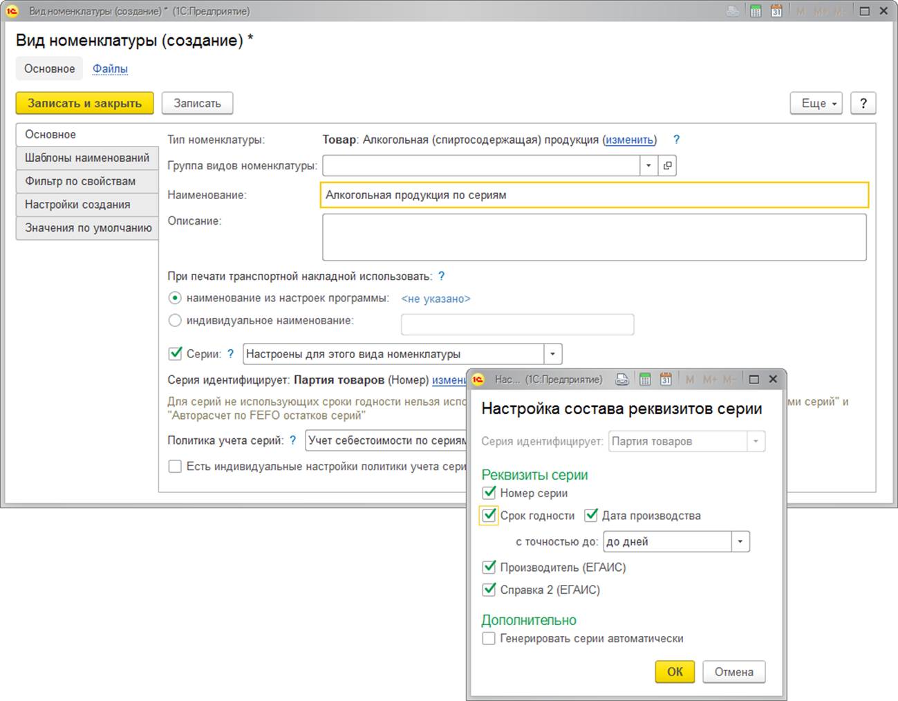 Для алкогольной продукции может быть организован учет по сериям. Серия для алкогольной продукции всегда идентифицирует партию товаров, а в состав реквизитов серии наряду с прочими могут быть Производитель (ЕГАИС) и Справка 2 (ЕГАИС).