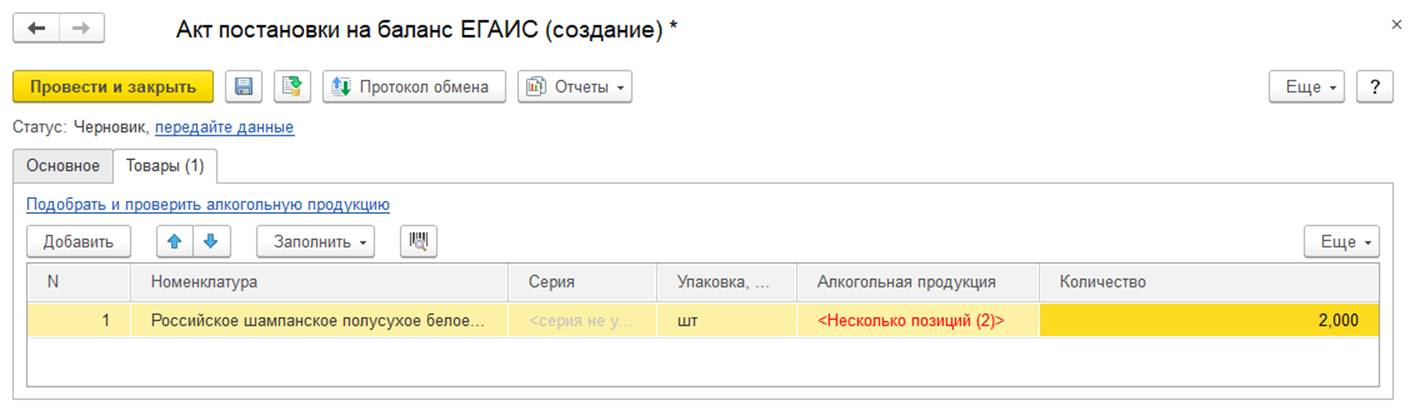 Для алкогольной продукции, учитываемой по партиям необходимо предварительно оформить передачу алкогольной продукции в регистр 2. Передача алкогольной продукции, учитываемой поштучно, в регистр 2 не производится.