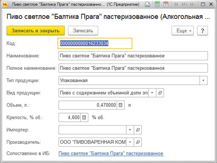 создать новый элемент справочника, заполненный сведениями из классификатора ЕГАИС. По кнопке Сопоставить классификаторы можно провести сопоставление производителей