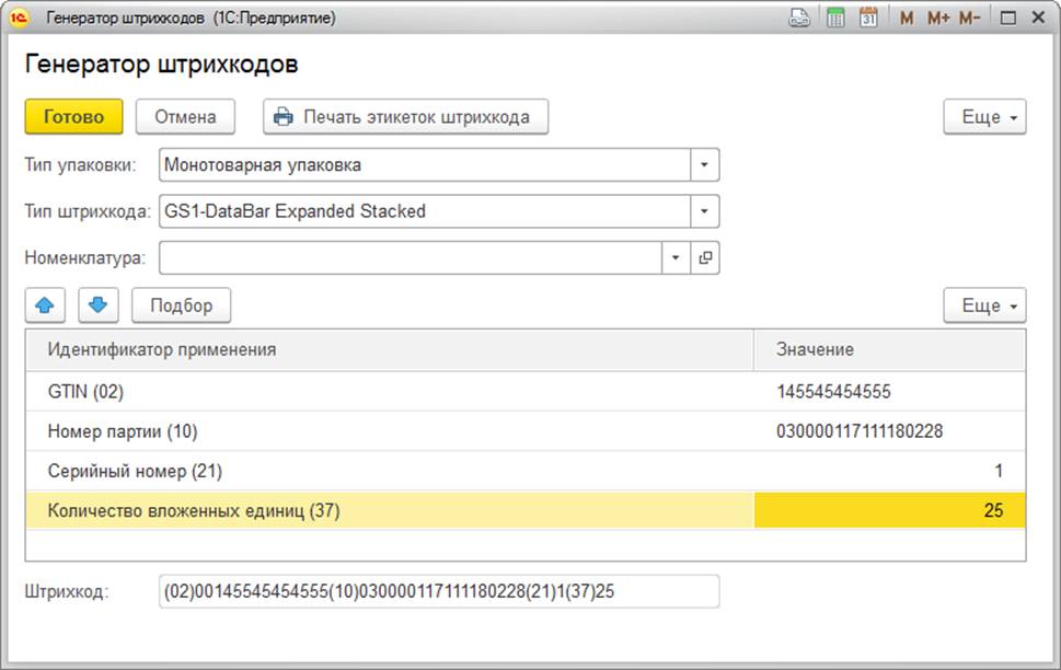 Предприятие может сформировать свои штрихкоды для имеющейся упаковки по кнопке