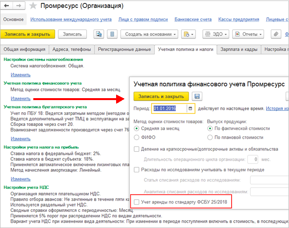 Настройка Учет аренды по стандарту ФСБУ 25/18 перенесена из учетной политики бухгалтерского учета в учетную политику финансового учета, что позволяет вести учет по ФСБУ 25/18 «Бухгалтерский учет аренды» при отключенном регламентированном учете, так как при этом учетная политика бухгалтерского учета не доступна.