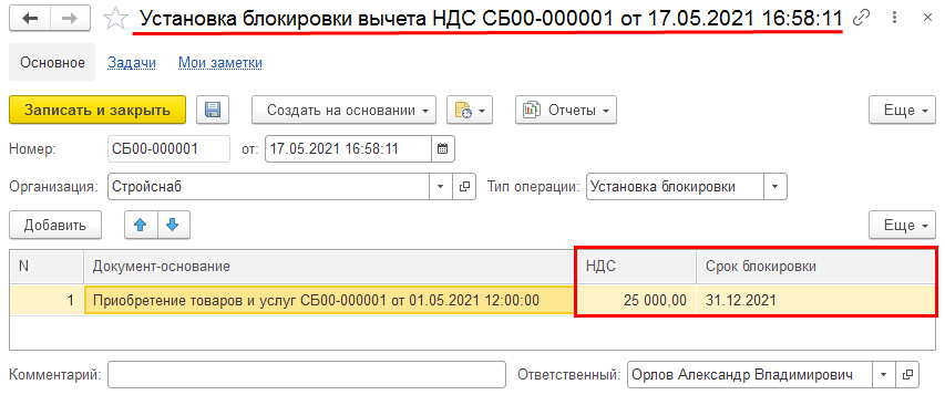 Необходимо обратить внимание, что блокировка снимается по документу-основанию полностью. Возможность разблокировать часть суммы не поддерживается. Для уменьшения суммы блокировки можно ввести новый документ Блокировка вычета НДС и указать в нем нужную сумму НДС.