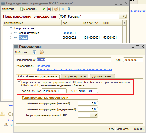 Изменение касается учреждений, имеющих обособленные подразделения, не выделенные на отдельный баланс (определение содержится в п. 2 ст. 11 НК РФ). В программе такие подразделения описываются в справочнике "Подразделения" с указанием соответствующего признака и собственных кодов ОКАТО и КПП (рисунок 1).