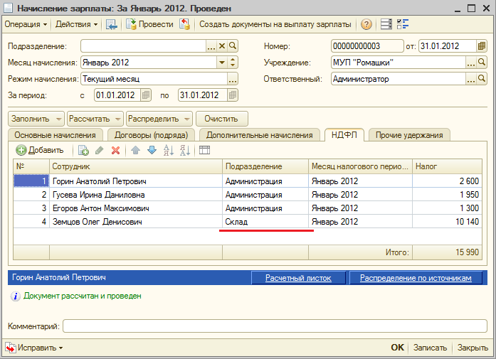 В п. 7 ст. 226 НК РФ содержится требование о перечислении налога, исчисленного и удержанного из суммы дохода, начисляемого и выплачиваемого сотрудникам обособленных подразделений, по месту нахождения таких подразделений. В связи с этим в программе ведется учет налога в разрезе подразделений (рисунок 2). При расчете анализируется подразделение из кадровых данных сотрудника, т.е. подразделение, куда сотрудник принят документом "Прием на работу " или переведен документом "Кадровое перемещение".