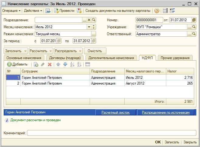 При расчете НДФЛ в июле 2012 налог будет зарегистрирован с разными месяцами налогового периода (рисунок 7)