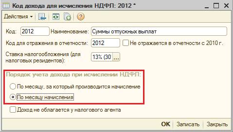 В виду того, что создание нового элемента справочника "Коды доходов НДФЛ" при необходимости изменить порядок учета дохода в виде, например, оплаты отпуска, и указание его в настройках соответствующего вида расчета не является для пользователя очевидным и тривиальным действием, в версии 1.0.44.1 эта задача упрощена. Появилась возможность даже для уже существующих кодов дохода явно задать порядок учета при исчислении НДФЛ – по месяцу, за который производится начисление, или по месяцу, в котором производится начисление.