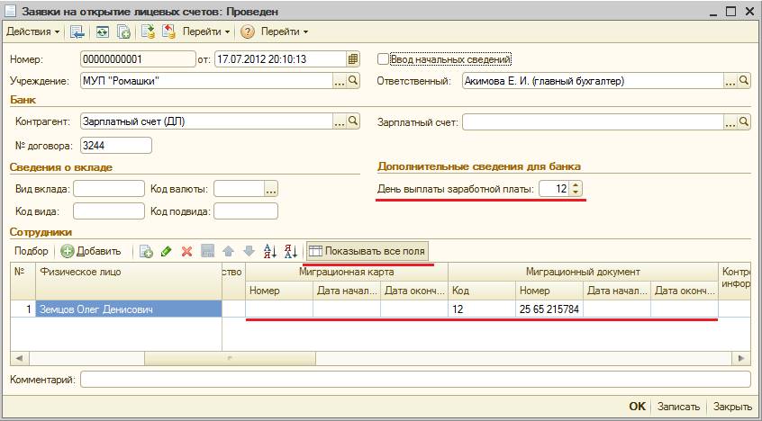 Часть новых реквизитов доступна для заполнения в документе "Заявка на открытие счетов". Предполагаемый день выплаты заработной платы указываются в шапке документа, данные о миграционной карте/документе и прогнозируемый доход – в его табличной части после нажатия кнопки "Показывать все поля" (рисунок 10).