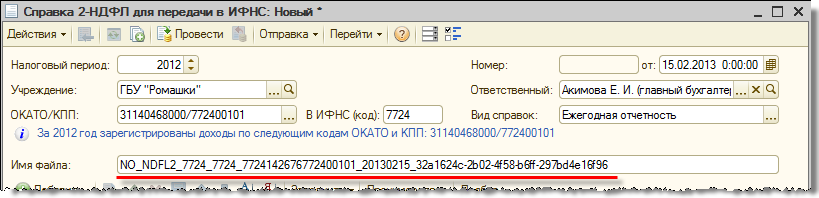 До версии 1.0.53 было возможно возникновение следующей проблемы. При создании нового документа "Справка 2-НДФЛ для передачи в ИФНС" в его форме программой автоматически формируется строка, которая используется в качестве имени файла при его формировании. Это имя содержит в себе уникальный идентификатор.