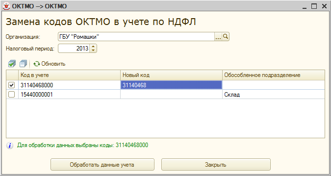 Помощник определяет по выбранному учреждению за выбранный налоговый период коды ОКТМО, которые были зарегистрированы в учете (а также указаны в карточках учреждения или подразделения).