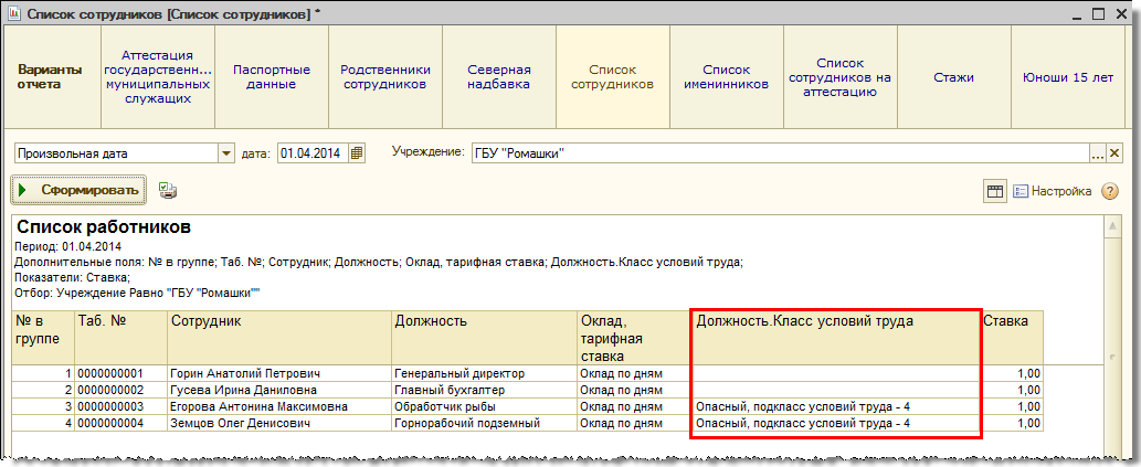 По просьбе пользователей в организациях, применяющих результаты оценки условий труда, в доступные при настройке вариантов отчетов данные добавлены указанные для должностей организаций классы условий труда. Сведения о классе условий труда реализованы в виде свойства должности в следующих отчетах: