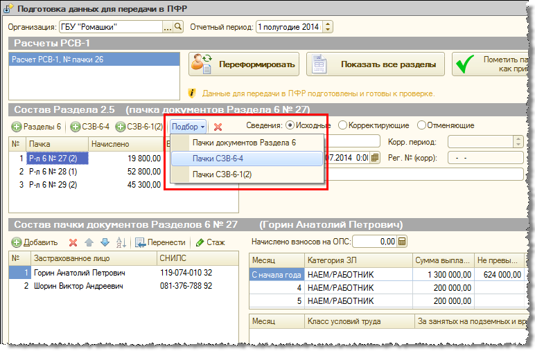 Формирование всего отчета РСВ-1, в том числе его разделов 6, предполагается производить из рабочего места подготовки данных для ПФР. Из рабочего места как автоматически формируются разделы 6, так и имеется возможность добавить их вручную. Также имеется возможность добавить вручную и документы СЗВ-6-4(1, 2) при подготовке корректирующих сведений.