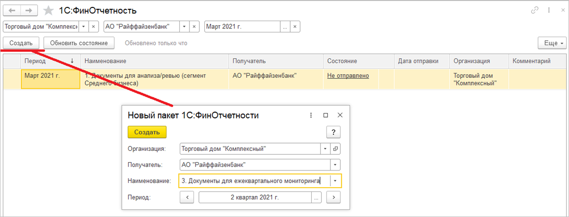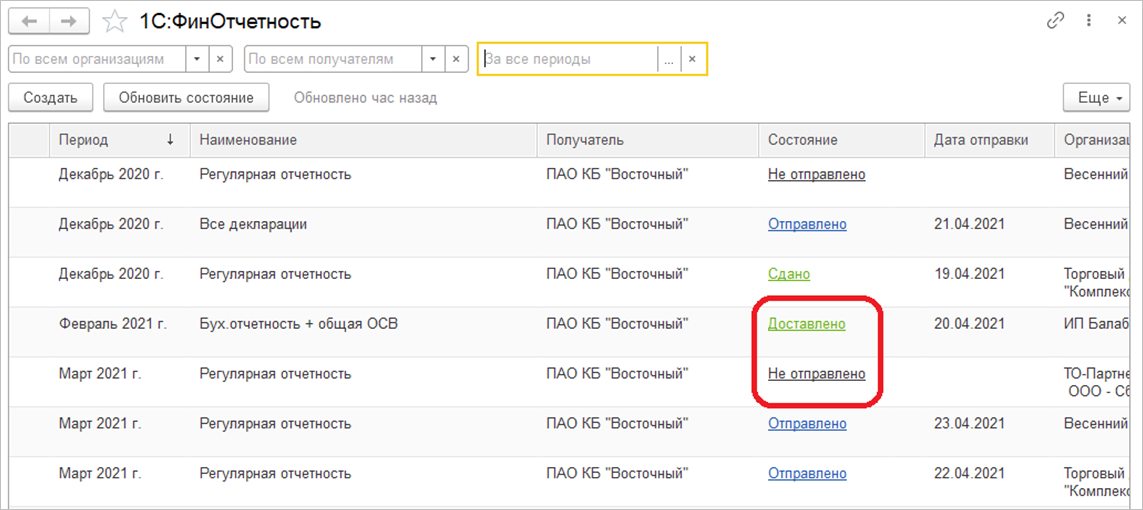 После отправки состояние пакета отчетности изменится на Отправлено. Получив пакет отчетности, банк направляет уведомление об этом, и состояние у пакета отчетности становится Доставлено. После того как банк проанализирует отчетность, он присылает протокол. И если у банка нет вопросов, то состояние - Сдано. Если же у банка есть замечания к отчетности, то состояние - Отклонено.