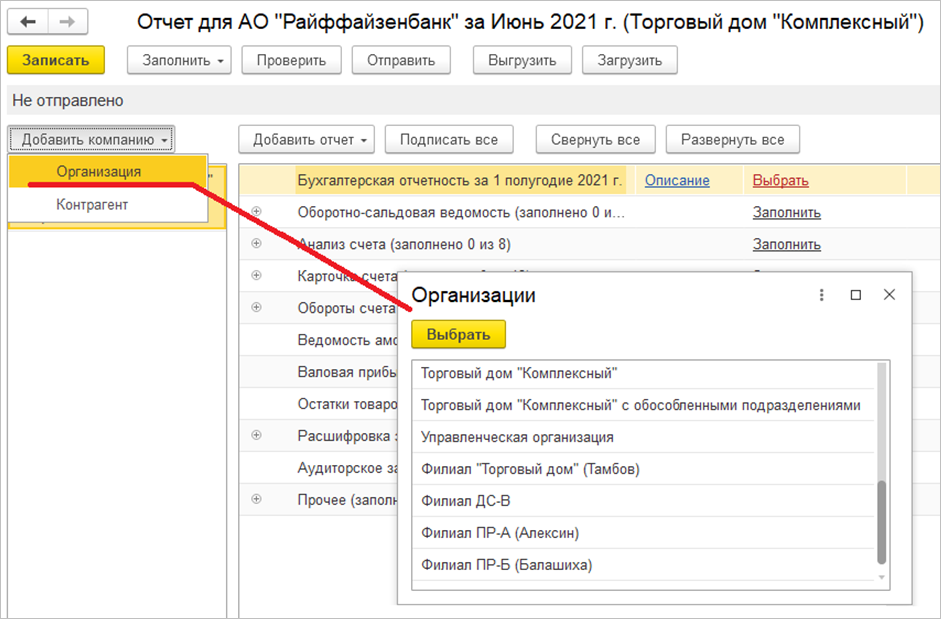 После создания нового пакета отчетности в него будет сразу включена основная компания группы, которая была указана на предыдущем шаге.