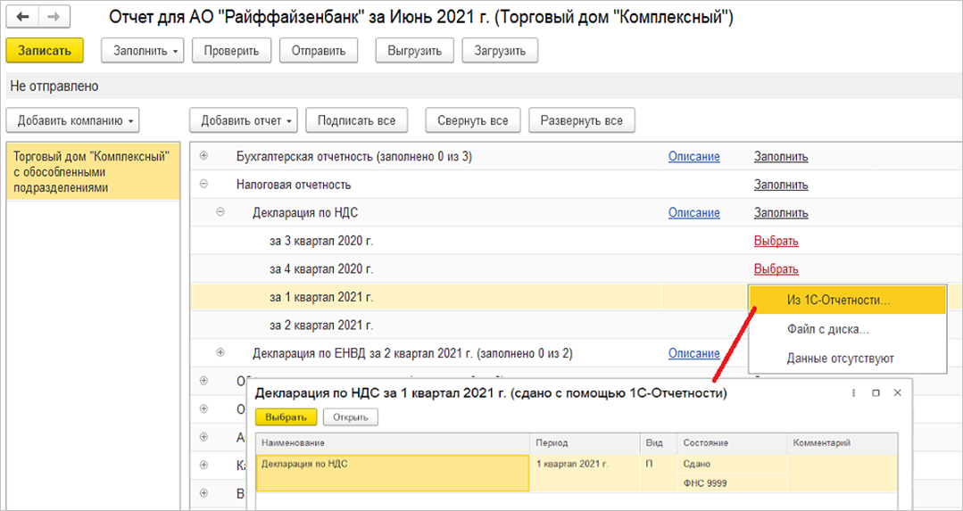 Бухгалтерская отчетность и налоговые декларации в пакет 1С:ФинОтчетности подбираются из ранее созданных в списке 1С-Отчетности.