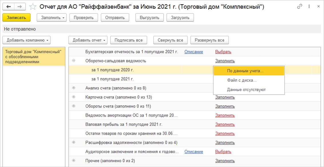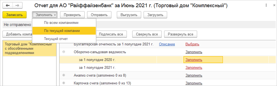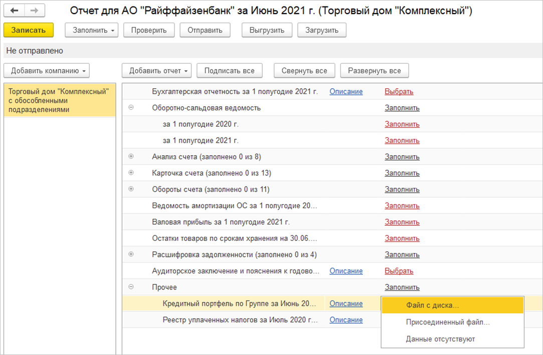 Если разные компании группы ведут учет в разных базах, то каждая компания может подготовить отчетность в своей базе. После чего с помощью кнопок Выгрузить / Загрузить передать ее в общий пакет по всем компаниям группы.