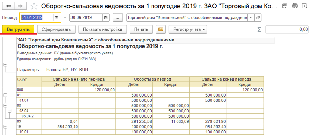 При интерактивном открытии отчета из пакета 1С:ФинОтчетности в окне дополнительно отображается кнопка Выгрузить, после нажатия на которую отчет сохраняется в присоединенный файл к пакету отчетности в формате Excel.