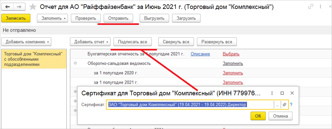 Подготовленный пакет необходимо подписать усиленной квалифицированной электронной подписью. Для подписания можно использовать электронную подпись для 1С-ЭДО, 1С-Отчетности, 1С:Подписи или других сервисов ЭДО, даже если они предоставляются не фирмой 1С. После подписания отчет можно отправлять получателю.