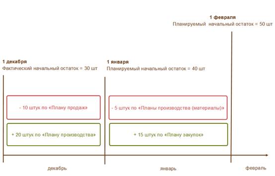 Рассмотрим работу с новыми операндом Планируемый начальный остаток на примере. Сегодня 2 декабря. Мы хотим понять какие остатки по товару прогнозируются на январь-февраль. Периодичность планирования - месяц. На 1 декабря мы имеем фактический остаток - 30 штук "Товара 1". На декабрь введен план продаж и план производства. С учетом этих документов на конец декабря - начало января мы получим 30 -10 + 20 = 40 штук. На январь введен план закупок и план производства, в котором "Товар 1" используется как материал для изготовления другой продукции. Соответственно, на конец января - начало декабря мы имеем 40 -5 + 15 = 50 штук.