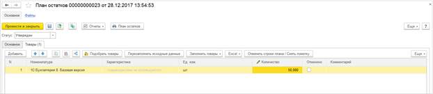 Рассмотрим работу с новыми операндом Планируемый конечный дефицит на примере При заполнении плана закупок можно использовать операнд Планируемый конечный дефицит. Пусть на 1 декабря 2017 года введен план остатков - 50 штук 1С:Бухгалтерия 8. Базовая версия.