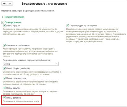Планирование остатков определяется функциональной опцией НСИ и администрирование – Настройка НСИ и разделов – Бюджетирование и планирование – Планирование – Планы остатков.